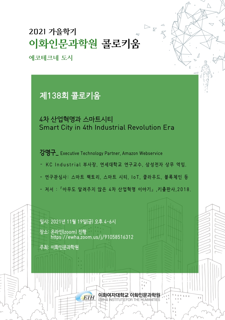 이화인문과학원에서 주최하는 <제138회 에코테크네도시 콜로키움>을 안내드립니다.