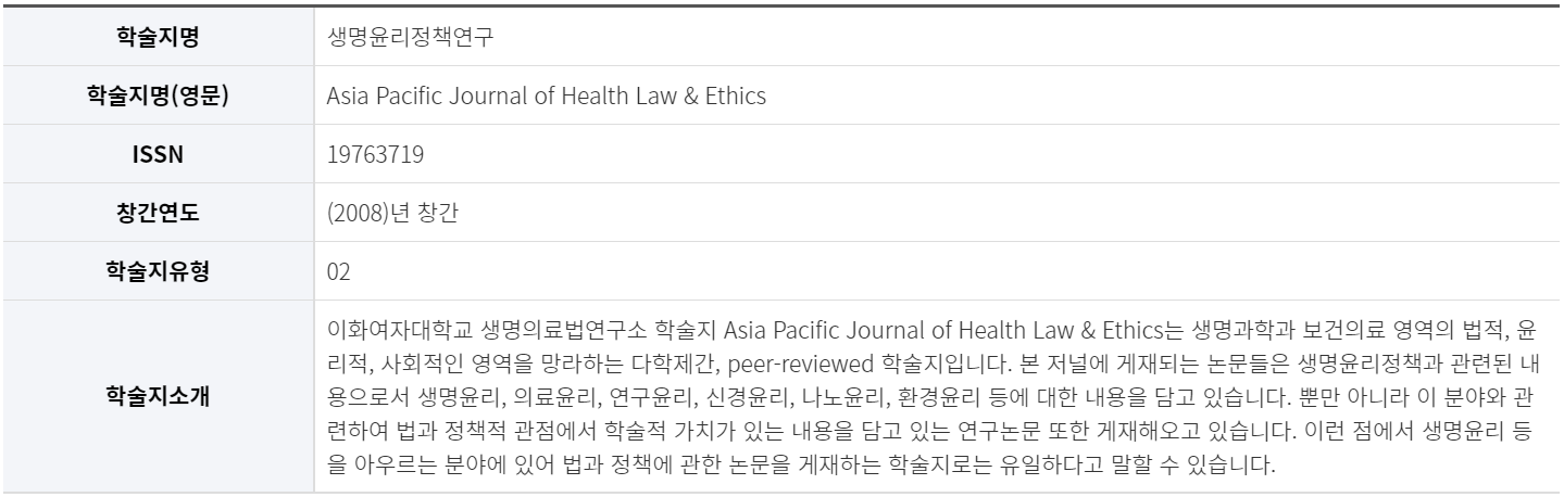 『생명윤리정책연구(Asia Pacific Journal of Health Law & Ethics)』